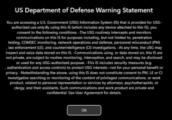 8.  Read and select OK on the US Department of Defense Warning Statement